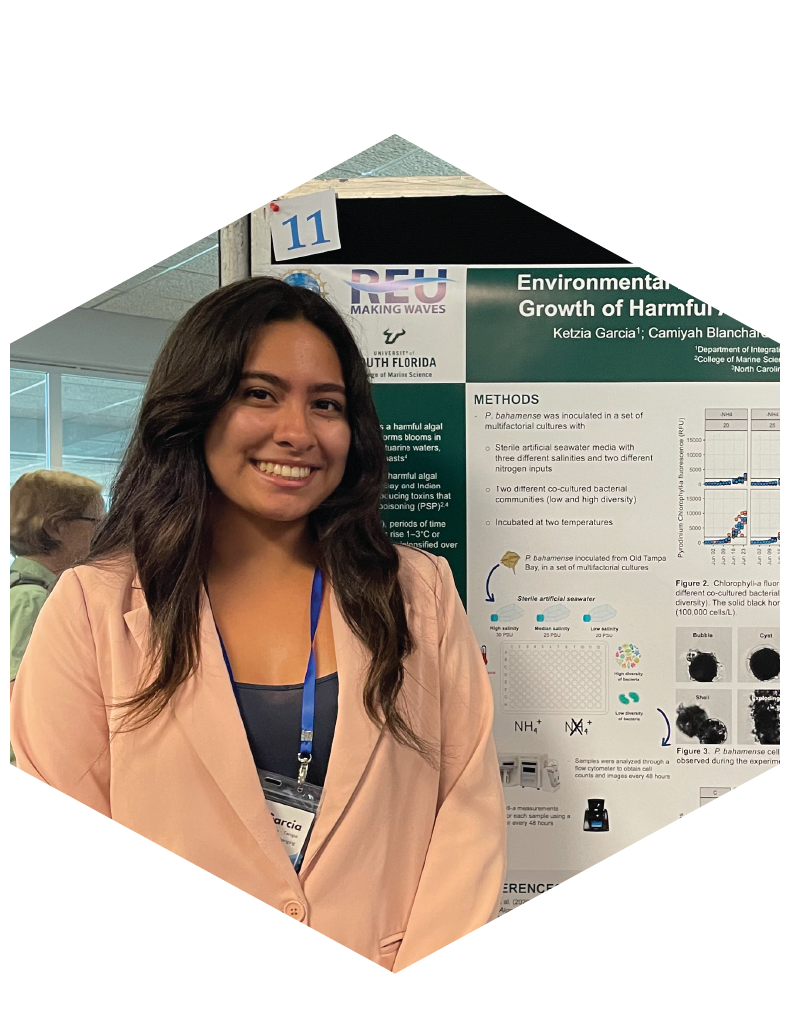 From May–July 2025, the MICOlab hosted two NSF REU students—Ketzia Garcia and Camiyah Blanchard—from the Making Waves REU program at USF. The program includes cohort building activities, networking, and science communication training in addition to their scientific research. Ketzia and Camiyah worked together running a large factorialized experiment investigating how microbiome composition, nitrogen availability, salinity, and temperature affect Pyrodinium bahamense growth and toxin production. The two students took growth measurements every 48 hours by Chlorophyll-a fluorescence and imaging flow cytometry with the Attune CytPix Flow Cytometer. The flow cytometry allowed us to track P. bahamense and bacterial cell concentrations, as well as P. bahamense cellular morphology. The students also learned how to perform DNA extractions and PCR to determine if the experimental conditions caused the P. bahamense microbiomes to shift in composition. The experience culminated in creating and presenting research posters for the USF undergraduate research symposium, where Ketzia won runner-up for best poster. Both Ketzia and Camiyah are now in their senior years at USF and North Carolina A&T State University, respectively.